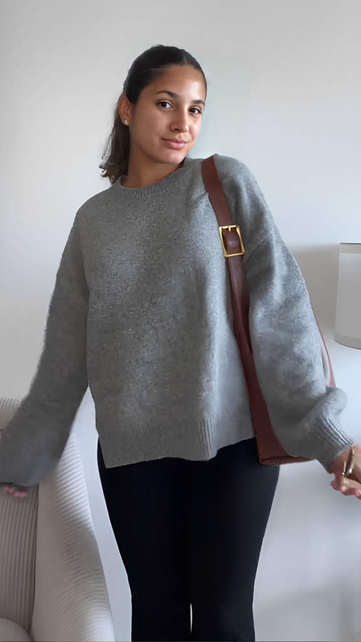 "I absolutely LOVE this jumper. The gray color is so flattering. I ordered the medium and it's perfectly oversized. I think this is definitely a sweater that you can wear casually or on a night out. It's not itchy at all and comfortable to wear all day long. Very happy!"